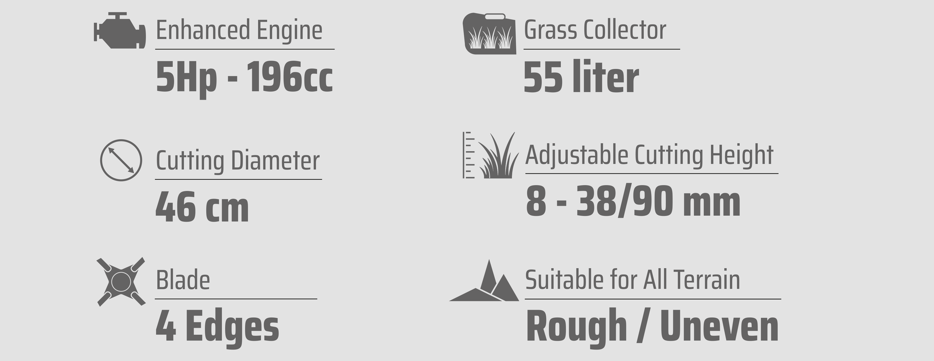 • Petrol lawnmower with a powerful 5 HP (196 cc) engine: ideal for demanding work on overgrown and uneven terrain.