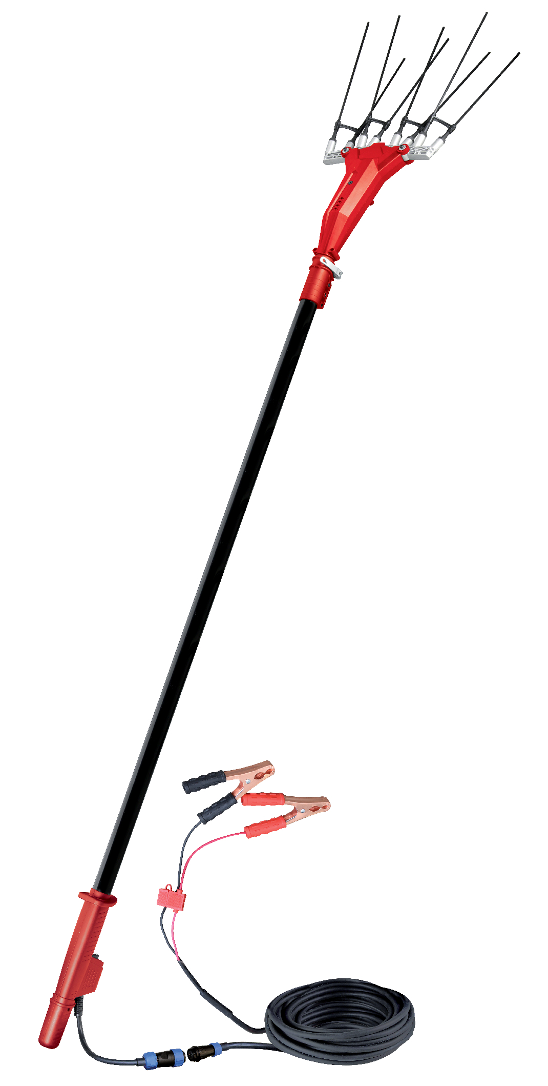 Alimentabile con batteria 12V-45Ah o superiore (non fornita). Asta telescopica, lunghezza totale 200-300cm. 4+4 bacchette in fibra di carbonio diametro 5mm. Lunghezza cavo alimentazione 15m.