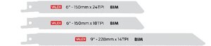 • Set 3 lame: legno (150 mm – 6 TPI), legno con chiodi bi-metal (150 mm – 6/12 TPI), metallo (150 mm – 18 TPI).