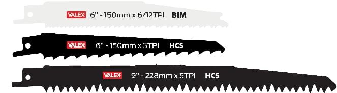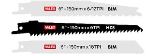 • Set 3 lame per legno: bi-metal 150 mm 6/12 TPI, lama per legno verde 228 mm 5 TPI, lama per legno 150 mm 3 TPI.