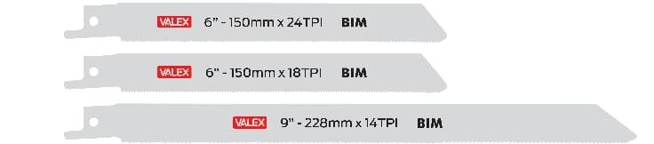 Set 3 lame bi-metal per metallo: 150 mm 24 TPI per lamiere fini, 228 mm 14 TPI per spessori 2.5–8 mm, 150 mm 18 TPI per lamiere medie.